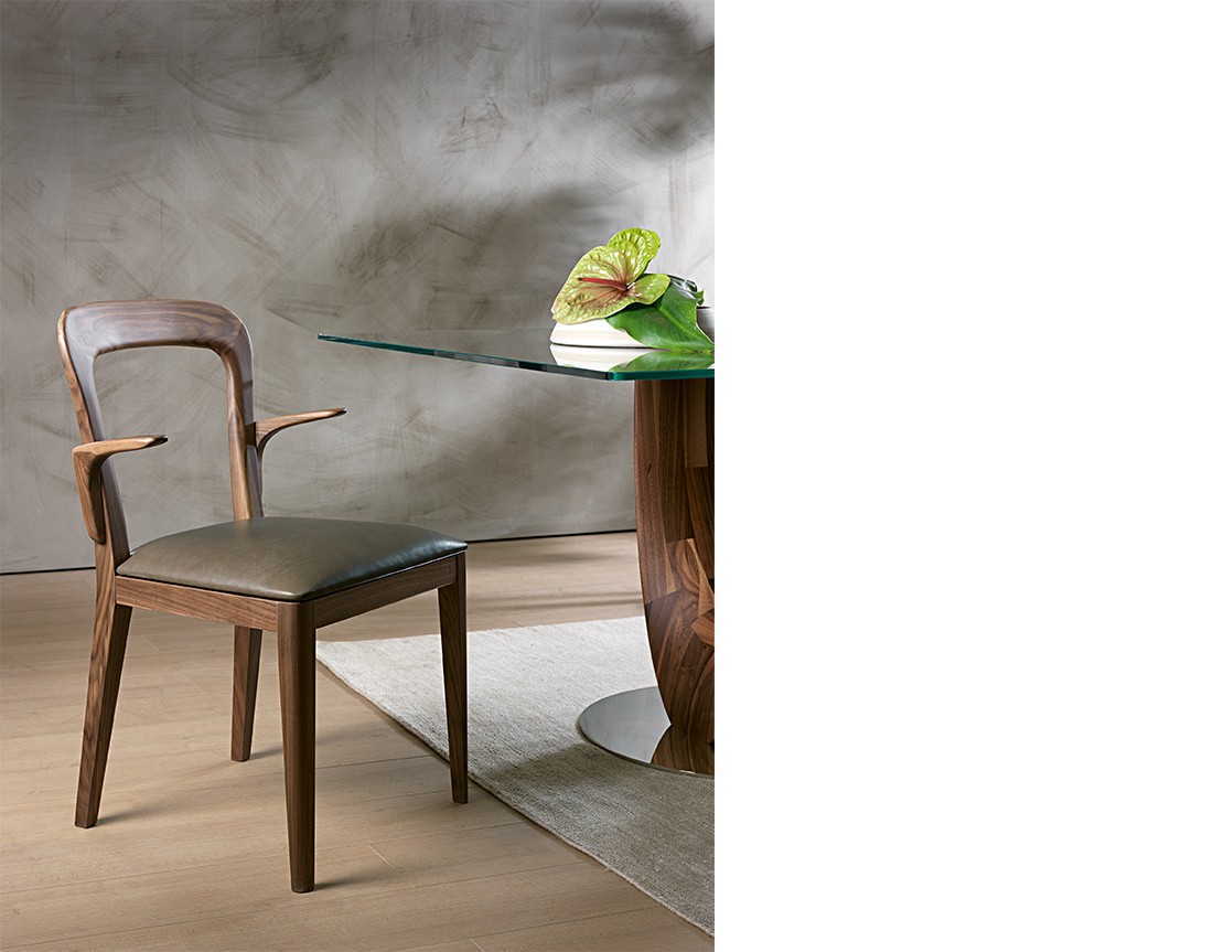 Sedia e poltroncina con struttura in massello di noce canaletto o frassino. Seduta rivestita in pelle, ecopelle o tessuto della collezione. Rivestimento in tessuto fisso o sfoderabile. Finiture disponibili: WG wengé, NC noce, TB tabacco, NK noce canaletto, laccato opaco poro aperto ( L21 bianco, L29 madreperla, L23 cappuccino, L25 grigio fumo, L22 nero, L24 rosso ).