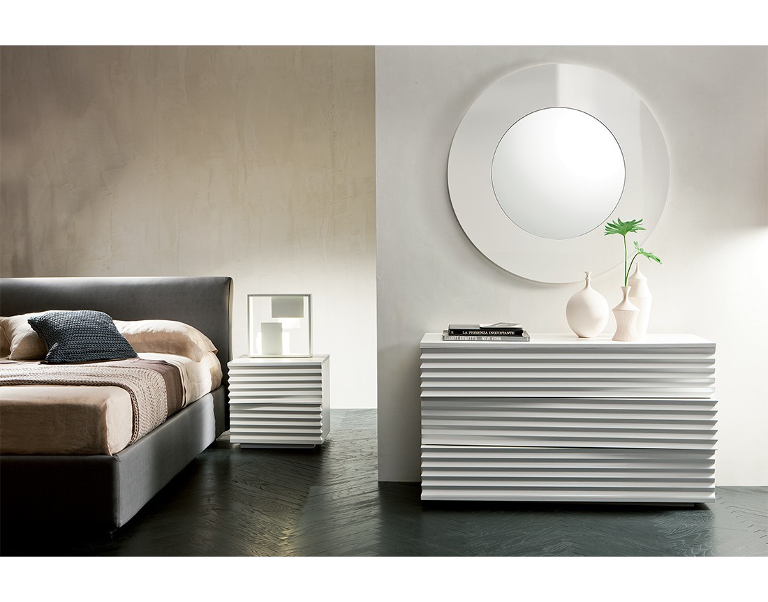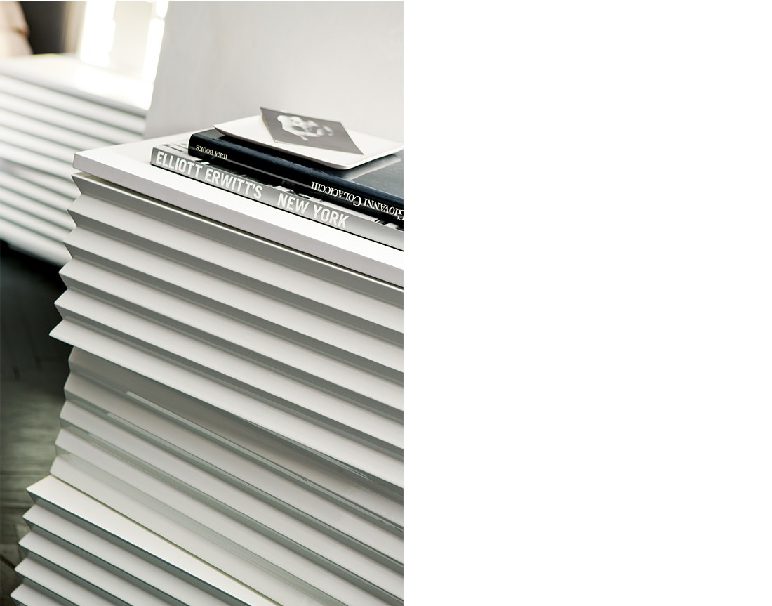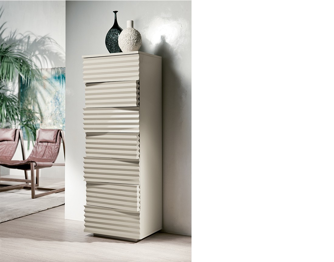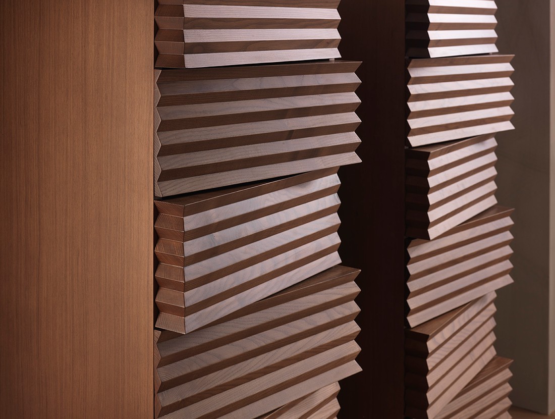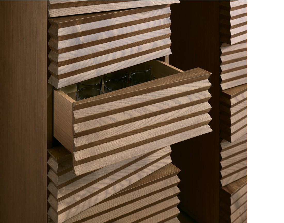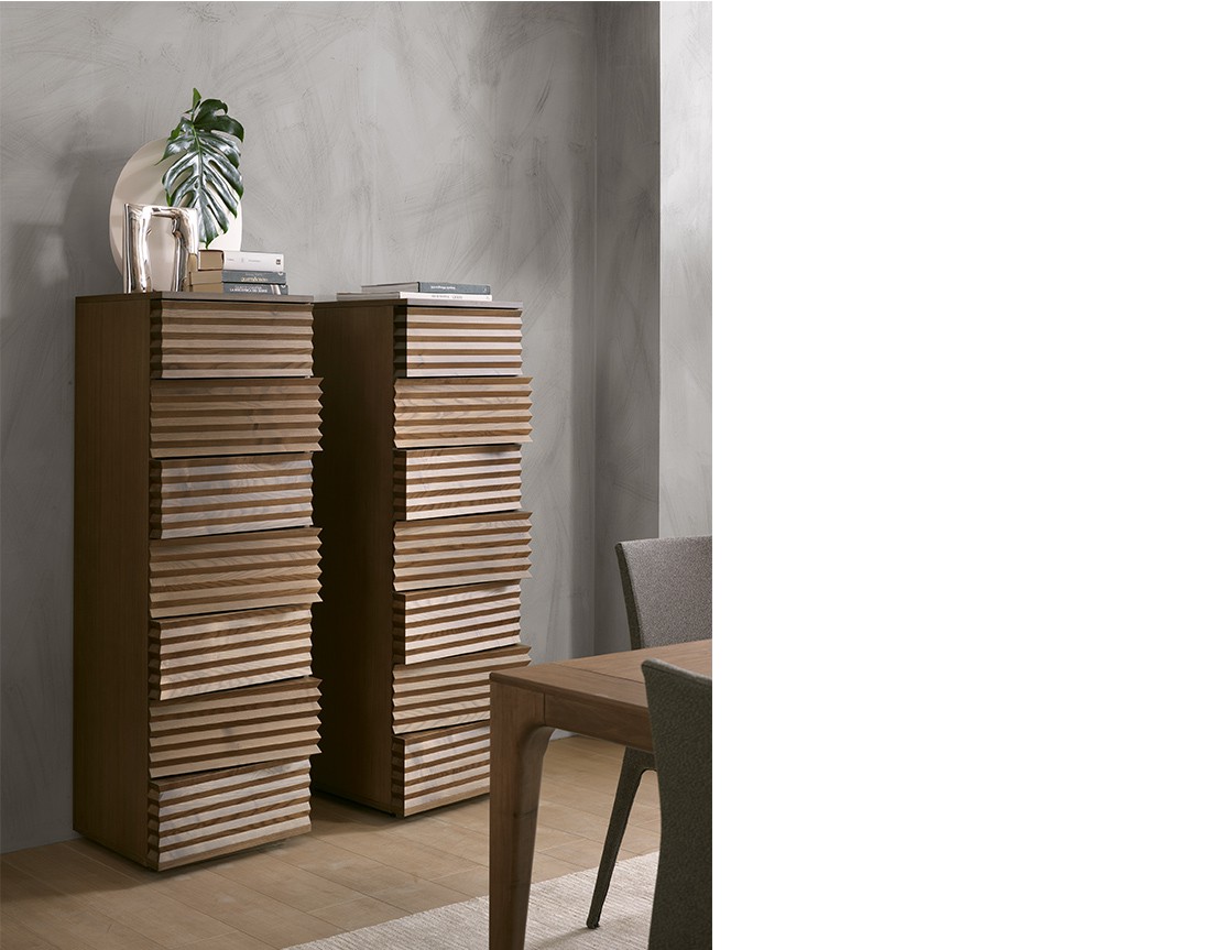 Tiffany sembra una scultura: la lavorazione scanalata dei cassetti, intagliati in modo da creare un motivo alternato, quasi ondulatorio, è la vera particolarità di questo settimanale. Le ombre proiettate sulla placcatura creano un interessante gioco di chiaroscuri, rendendo questo oggetto sempre diverso a seconda dell’angolatura da cui lo si ammira. Il pratico sistema Bluemotion, inoltre, assicura la chiusura dei cassetti in totale tranquillità, evitando che urtino contro la struttura.
