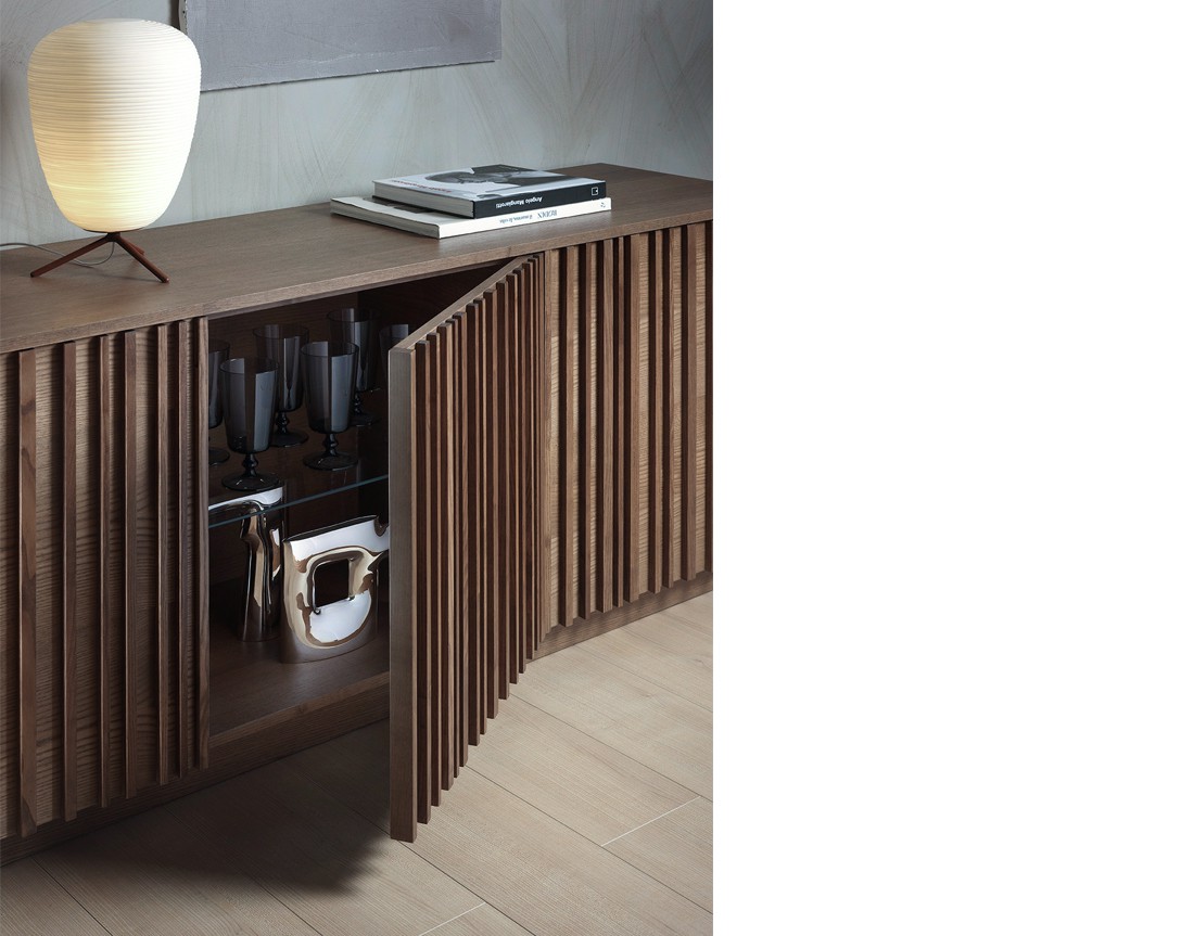 La sua preziosità ruota tutta attorno all’attenta e accurata lavorazione del legno massello di frassino, che disegna sulla superficie del mobile una texture originale di forte impatto visivo. Senza perdere le caratteristiche di simmetria e continuità – date anche dall’assenza di maniglie – Line è un oggetto adatto a dare sicurezza e insieme forza comunicativa a qualsiasi ambiente. La praticità, inoltre, incontra il gusto, grazie agli ampi vani contenitori dotati di ripiani in vetro naturale.a madia.