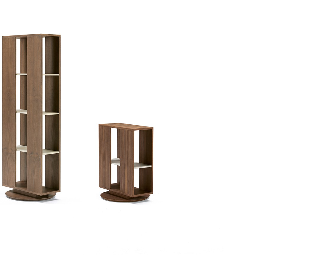 Elemento portalibri girevole con struttura, base e ripiani placcati noce canaletto. A richiesta, ripiani laccati opachi poro chiuso ( L1 bianco, L19 madreperla, L3 cappuccino, L5 grigio fumo, L2 nero, L4 rosso, L40 beige microgoffrato, L41 ecrù microgoffrato, L42 fango microgoffrato ). Finiture disponibili: WG wengé, NK noce canaletto.