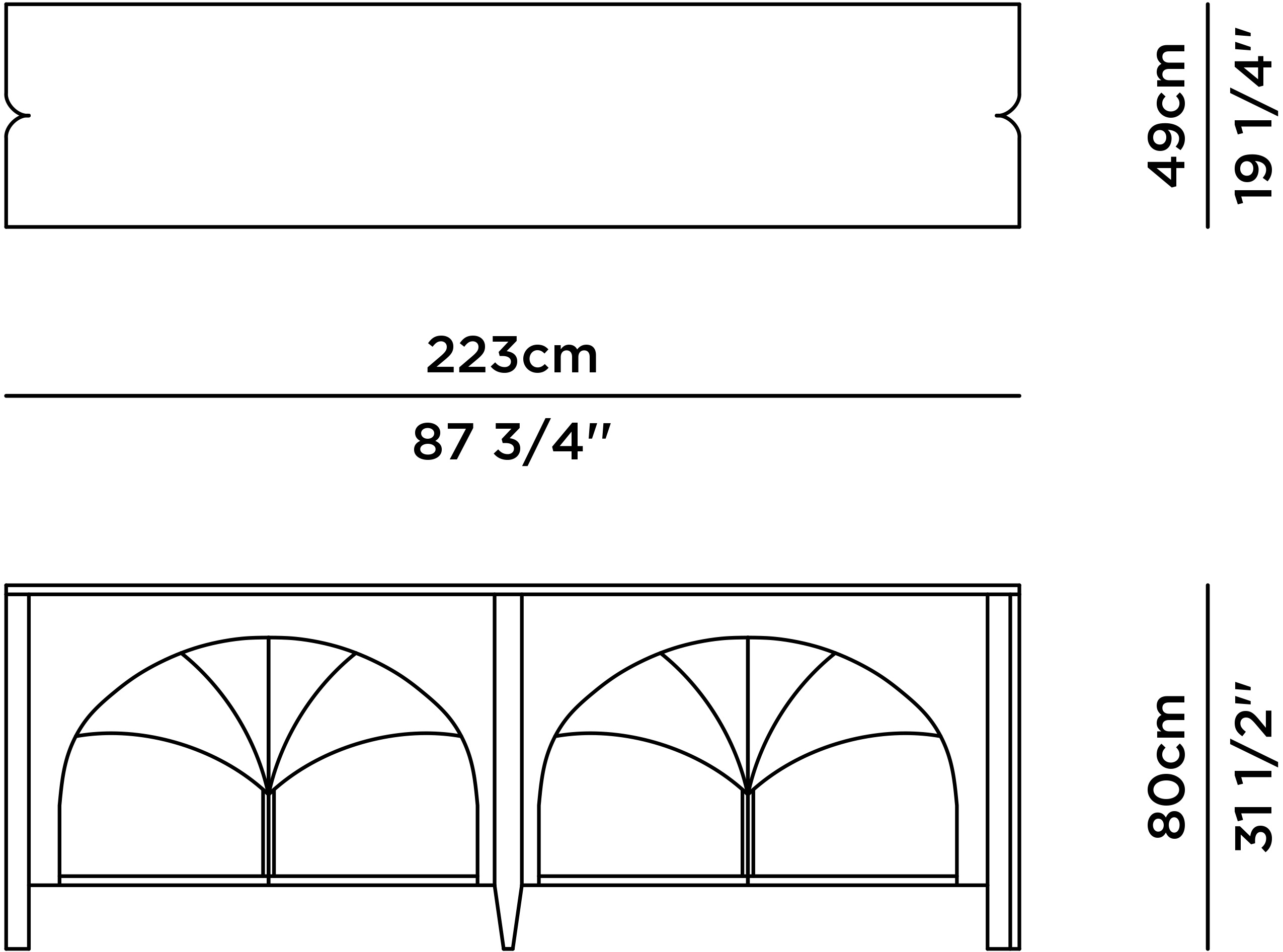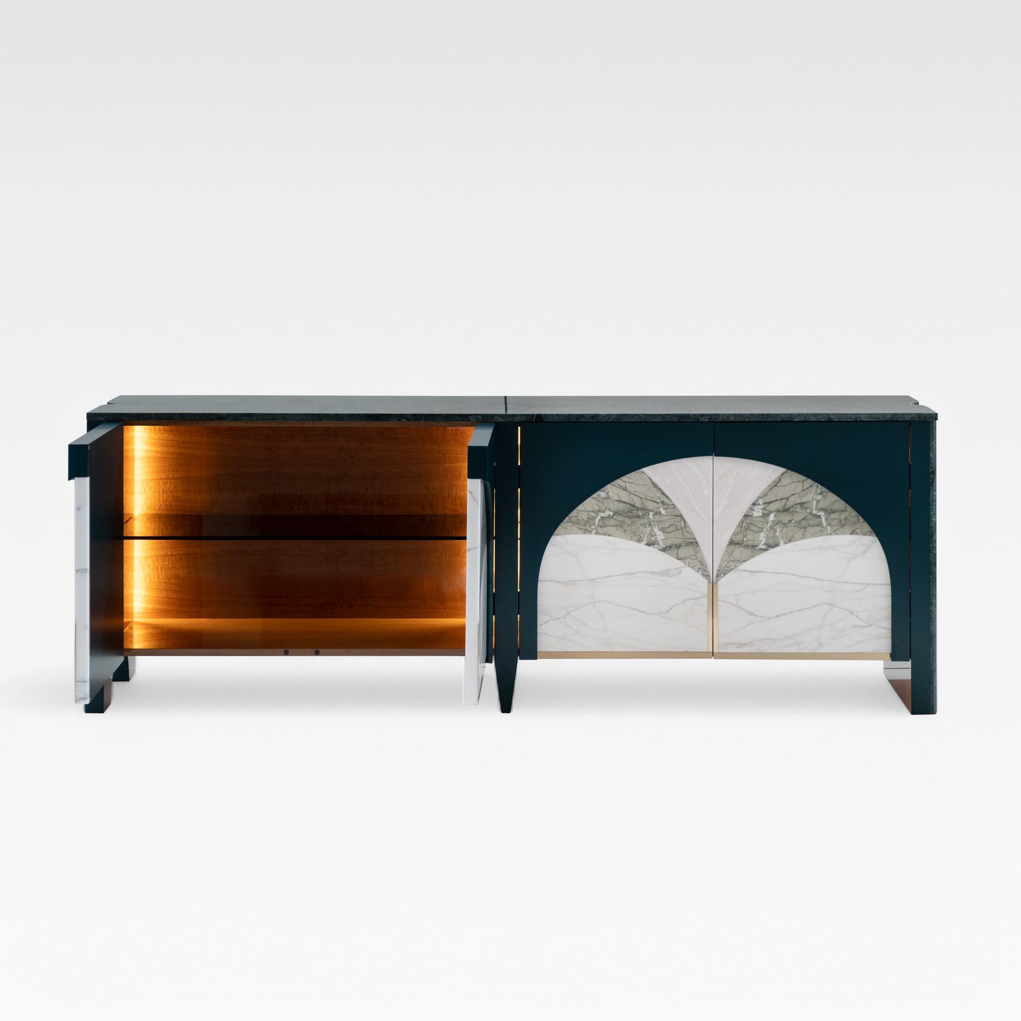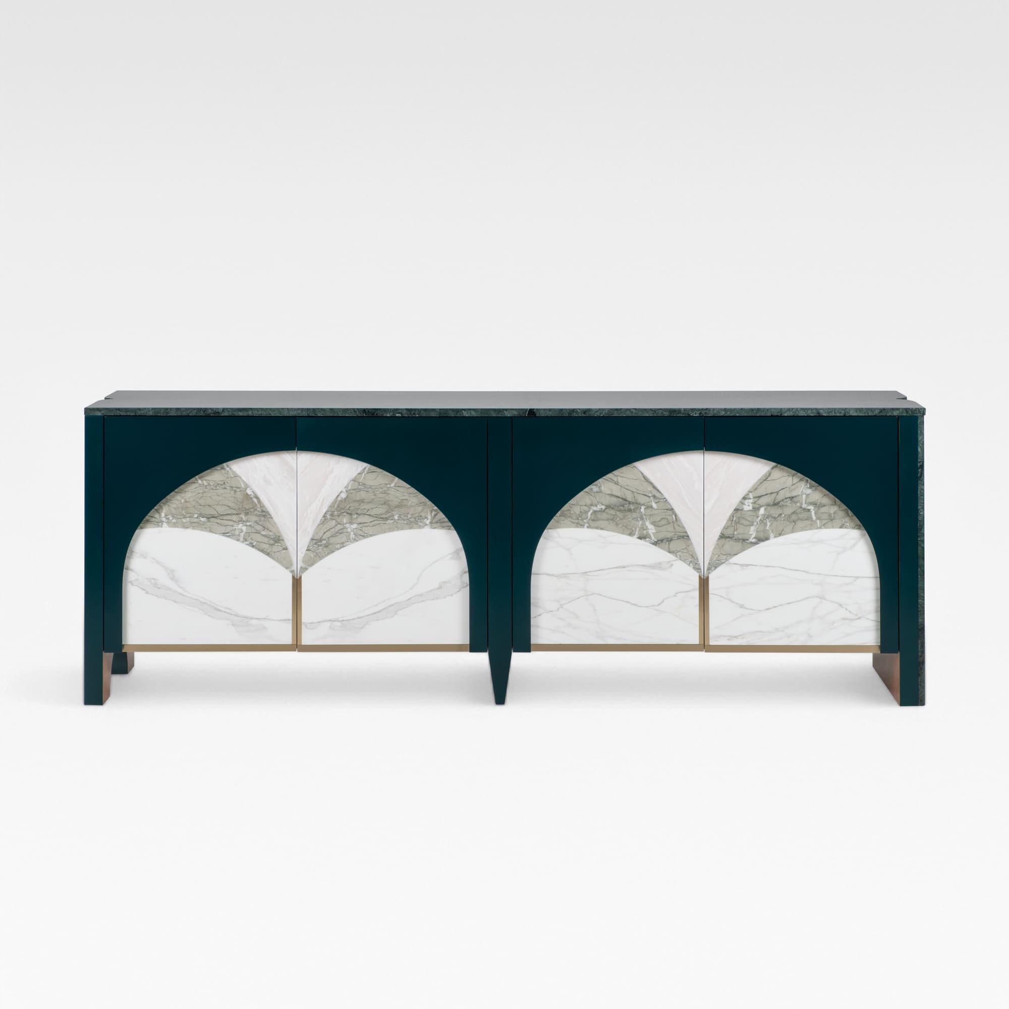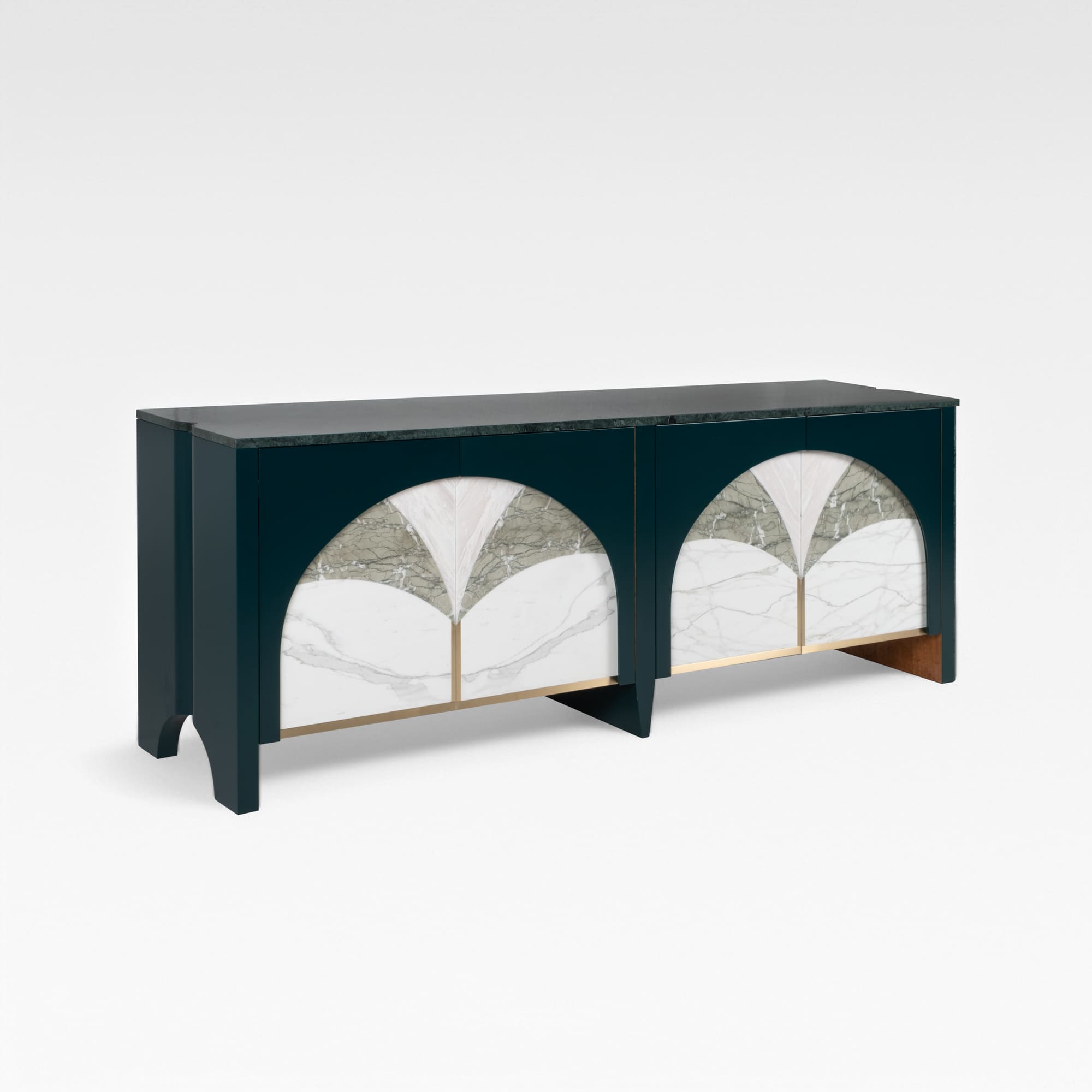 The Biloba marble sideboard celebrates Portuguese architectural heritage and organic design, resulting in a creation rich in history and artistry. Drawing inspiration from the Alcoba?a Monastery, its Gothic and Baroque influences are reimagined through signature arches, meticulously crafted from three distinct marbles to form the delicate patterns of Gingko Biloba leaves. With a thoughtful balance of tradition and contemporary design, the Biloba marble sideboard stands as a timeless, heirloom-quality furniture piece.